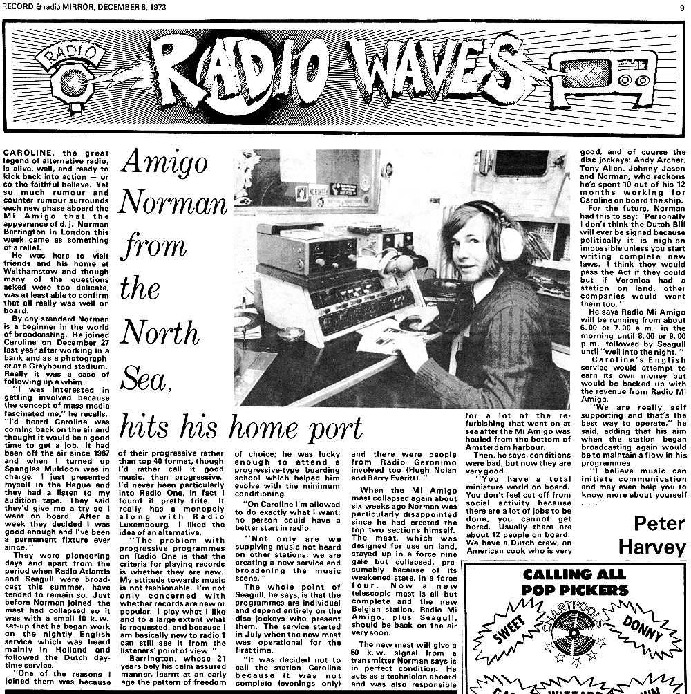Back working in London, I naturally continued to keep an eye on any developments with Caroline, and then in 1972 I heard about the intentions to return the Mi Amigo to the North Sea and re-start broadcasting! The Museum story had simply been a very clever cover, to get the ship sea-worthy again. No mean feat since this included pumping out the lower decks which were flooded, drying out the transmitter components which had also been submerged for 3 years, and clearing up the mess left by vandals, who had thrown singles all around the ship, and let off all fire extinguishers etc. Incredibly, late in 1972 Test Broadcasts could be heard in the UK. It was Christmas 1972 and I had decided it was time for my move. I recorded a demo tape with the help of John Ker, gathered some useful jingle and production masters and headed for Holland fully intending to get a job. John O'Sullivan came with me, once again, we hired a car and we had a short break around our favourite haunts in Amsterdam, then I planned to go to Caroline for the job interview, with John returning to the UK. I arrived at the Caroline office which was at the time in Zeekant, Scheveningen overlooking the sea, and with the Caroline, Veronica and RNI ships visible on the horizon from the window. On the way upstairs, I passed Graham Gill who was heading down at the time. I recall he turned and gave me a strange yet not unfriendly lingering look, which I later learned was because I was being 'graded'. Graham, it seems, was a connoisseur of boys' bums, and I had just been awarded a Grade 'A'. Fortunately, the three predatory gays around, Graham, Tony & Andy, had a policy of leaving colleagues alone, for the sake of peace on board, but I digress. The Caroline people were renting the top floor of the Zeekant property as a centre of operations - come office - come sleeping quarters. The Boss was Chris Cary (assisted by his lovely wife Kate), he came across as friendly and a dynamo of energy which he fuelled on a diet of Coke and Mars bars. 'I wanna be a DJ' I said, in true tradition, or words to that effect anyway. I retrieved my audition tape from my holdall, and allowed Chris to see all the Jingle tapes too, which would be very useful onboard, and would come free with me, if hired, as a bonus! OK, he said, but we cannot play your tape since we have no tape machine here. No bother I said, I have a mate in the Hoek van Holland who will lend me one, so I nipped off down to the Hook, with my hired car and the friend Martin Van Dussen kindly lent me his machine. I returned to the office and played Chris and some others my demo. Amongst my choice of Music on that demo was Bob Dylan, Melanie, Santana, George Harrison and some other cool sounds. Chris said "Hey he sounds like a John Peel, we could use someone like that - You are hired." To celebrate we had a couple of joints, and I knew I had achieved the first stage of my plan. I was on the right wavelength. Actually he told me later, that if someone in a foreign country could, at the drop of a hat, come up with a tape recorder, then they must be a useful person to have around! Chris contacted the ship by shortwave radio. and advised that a new DJ was coming out, Andy Archer announced my planned arrival on air, saying "Norman Barrington, our newest DJ is coming out this week". It seemed a bit unreal, after all, I had given up a well paid job in the city without any warning, obviously I said nothing at work since it might have not turned out the way I planned, but the fact is, I didn't give myself any warning either, though, some philosopher once said "Nothing has a longer preparation than the impulsive act". Perhaps if I had given the move more conscious thought I would had never done it. From the Bank's point of view, I simply did not turn up the next Monday, and they never saw me again. But for me, events were to become even more unreal. I stayed for a couple of days at the Zeekant, and soon realised that the Caroline operation was not without it's funny moments. Chris was being continuously hounded by the PTT for illegal use of shortwave radio to the ship. How much simpler things would have been for us had they invented mobile phones by 72! One one occasion Chicago risked life and limb bringing a brand new radio link over only to loose his balance climbing the gangplank onto the tender, and dumping himself and the valuable Radio into the murky green Scheveningen Harbour, in retrospect lucky he wasn't crushed! But The Pleiters, owners of the house at Zeekant were also wanted by the police, when the police swooped the very next day, Mr Pleiter had disappeared (Now that may not seem funny, but when you realise the the Dutch word 'pleiter' actually means dissapear! you can see why we all laughed) and while they were searching the house, we were all keeping low key on the top floor hoping we wouldn't be involved. To my amazement, looking down to the street below, I could see the Pleiters' 14 year-old son running round deflating all the tyres on the police car It was the last week of December 1972, and just as I was finally due to go out on the tender from Scheveningen, the Mi Amigo was gone!, Literally! Unbelievably the Dutch crew had had the ship towed into the Westhaven in Central Amsterdam. Instead of going down to the tender, we all drove up to Amsterdam, and so it was that my first experiences onboard were like a nightmare, there we were, anchored just at the back of Central Station in Amsterdam! - not at all what I had anticipated. Why were we there? The Dutch crew had been convinced by their lying captain that although they had received no wages of late, the British DJs HAD been paid. This resulted in the very much publicised mutiny resulting if the ship very much inside the six mile limi - Amsterdam! They hoped that this would prompt Ronan O'Rahilly to pay up. Here's a newspaper cutting during the mutiny incident, of the ship in Amsterdam harbour on December 30th 1972, you can see me, Rob 